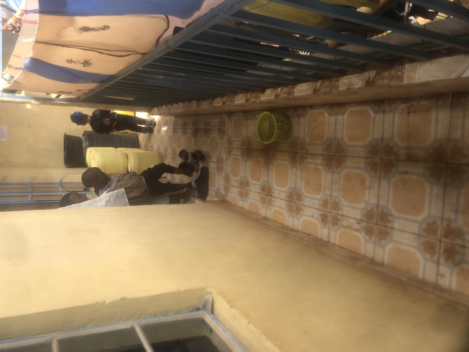 The image depicts a narrow outdoor corridor or balcony, approximately 1.5 to 2 meters wide, in Ngong ward, Kenya. The floor is covered with worn, light brown and white patterned tiles. A solid, light yellow-ochre painted wall runs along the left, featuring a window with a light blue frame in the upper left. Along the right, a dark blue metal railing is visible, with patterned blue and beige fabrics draped over it. Three individuals, appearing to be children, are present. On the left, a person in a light-colored garment is largely obscured by the wall. Adjacent to them, a child wearing a light brown jacket and dark trousers is visible, bending forward and appearing to attend to black slip-on sandals on the floor. Another pair of dark sandals rests nearby. Further down the corridor, facing away, a third child in dark clothing and a blue cap is visible. Against the far wall, a stack of at least three yellow plastic jerrycans for water storage is visible. Behind these, a black plastic basin rests on a black drum or barrel. A bright green perforated plastic bucket is positioned on the tiled floor in the middle of the corridor. The scene is illuminated by strong natural light, casting shadows on the floor.