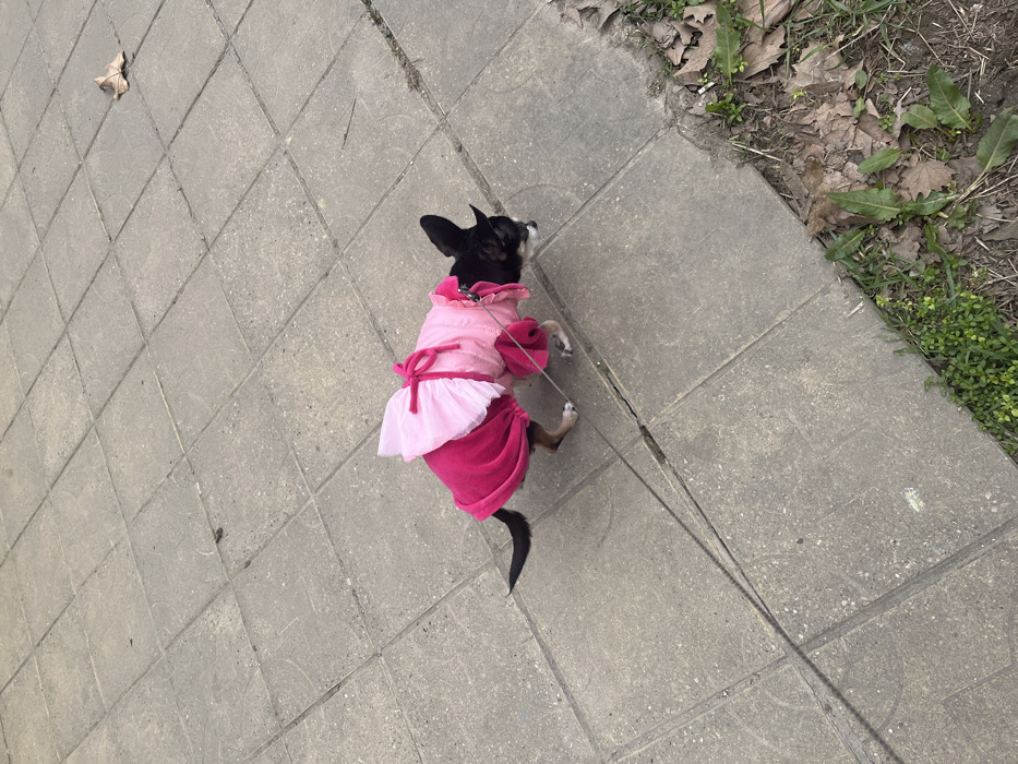 A small, black and tan dog, consistent with a Chihuahua breed, is depicted on a paved sidewalk in Ruse, Bulgaria. The dog is wearing a two-piece garment: a vibrant magenta full-body suit with a lighter pink, ruffled overlay on its back, complete with a pink bow. A thin, dark leash extends from the dog's chest harness towards the lower-left corner of the frame. The dog's head is lowered, and its snout appears to be sniffing the grey concrete paving slabs on which it stands. The pavement consists of rectangular tiles with visible seams and minor surface irregularities. To the right and bottom right of the paved area, a strip of disturbed soil is visible, containing scattered brown, dry leaves and sparse green herbaceous growth.