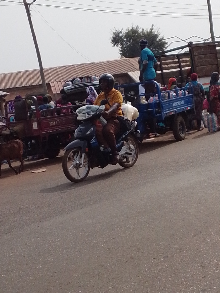 A man wearing a helmet and orange shirt rides a blue motorcycle on an asphalt road. Behind him, people sit and stand on flatbed trucks, loaded with belongings. A goat stands near one of the trucks. Buildings and power lines are visible in the background under a hazy sky.