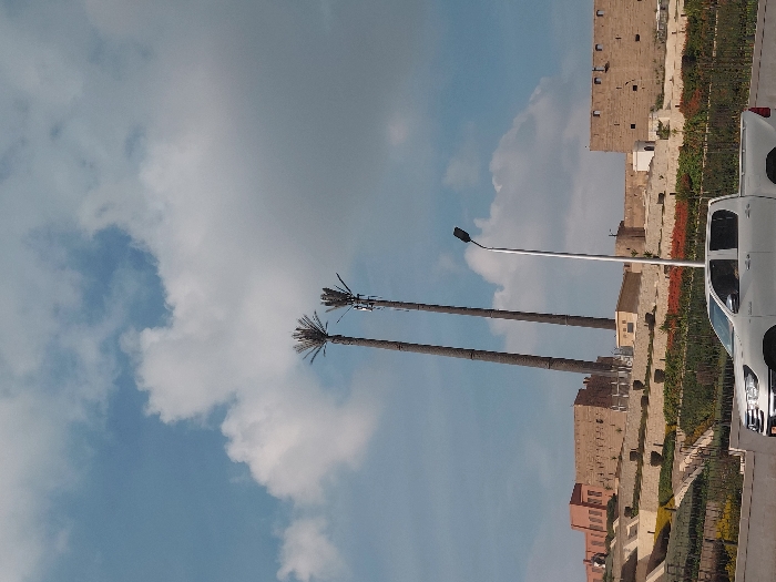 The image captures a daytime scene in Cairo, Egypt, displaying a blend of historical architecture and modern infrastructure. In the foreground, the front portion of a white Toyota Hilux pickup truck is visible, moving left to right on a paved surface. A silver street light pole with a black lamp head stands slightly right of the truck. The midground features a terraced, landscaped area planted with green shrubs and patches of red and orange flowers, interspersed with light-colored retaining walls and steps. Dominating the background are several light-brown, fortified stone buildings, consistent with the architectural style of the Salah El-Din Citadel. A larger building with reddish-brown upper sections is visible on the left, while a substantial stone wall with crenelations extends on the right. Positioned centrally behind the landscaped terraces are two tall, slender structures disguised as palm trees. The rightmost "palm tree" clearly functions as a cellular tower, with antennae and technical equipment visibly integrated into its upper, frond-like section. The sky above is partly cloudy, with significant white and grey cumulus clouds against a blue expanse. No individuals are visible.