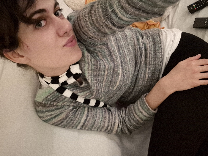 - "An indoor, eye-level photograph shows a young adult reclining or leaning back, looking towards the camera" by FM-O7Vkg2, licensed under CC BY 4.0