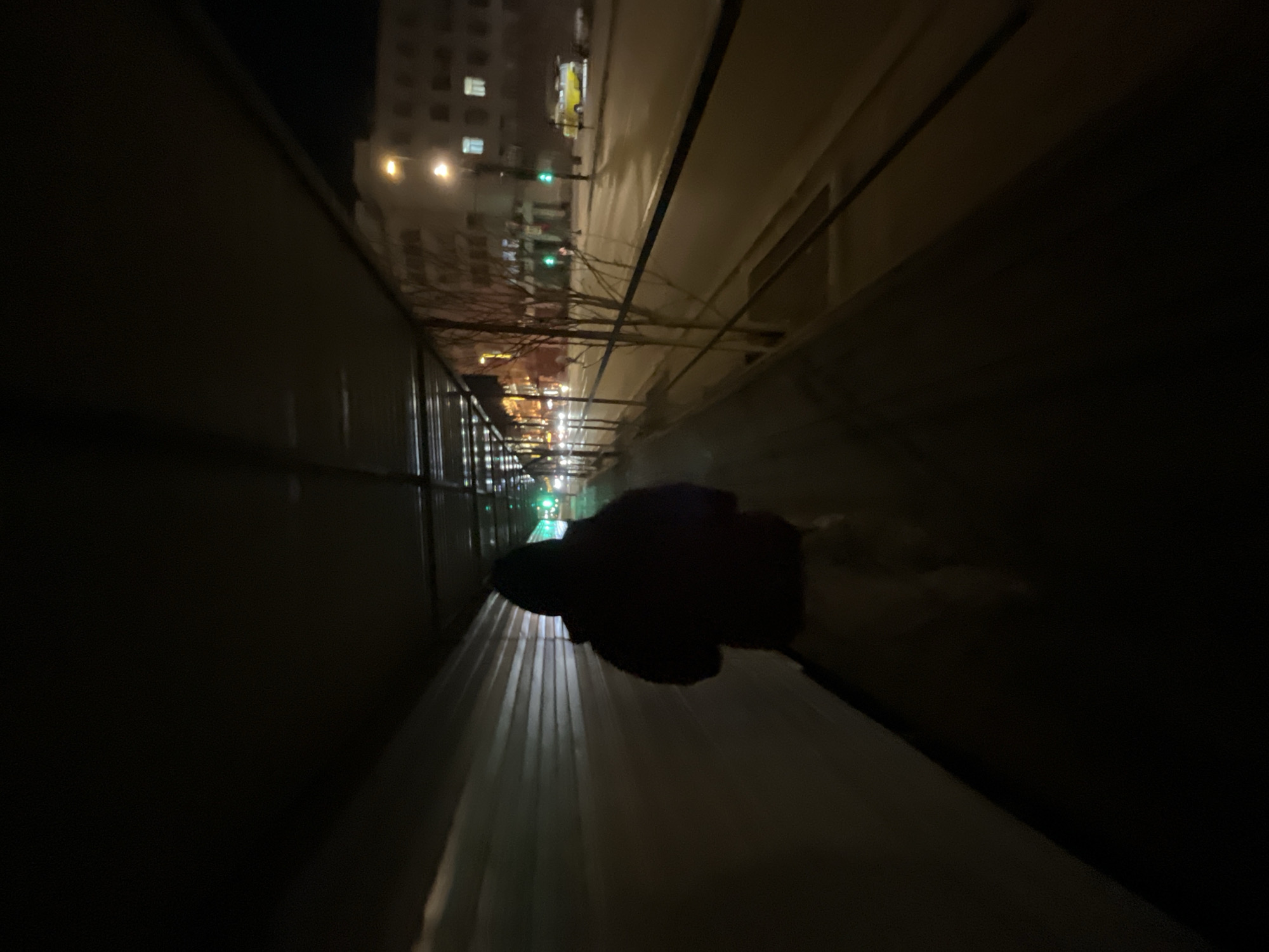 dark, elongated space with what appears to be a street or road receding into the distance, framed by structures on either side. At the far end, streetlights and building lights are visible. The lighting suggests a night scene. In the foreground, there's a dark, amorphous shape obscuring the view, potentially a person or object blocking the camera's perspective. The scene has a strong sense of perspective, leading the eye towards the brighter, distant area. The location is likely an urban tunnel or enclosed passageway.