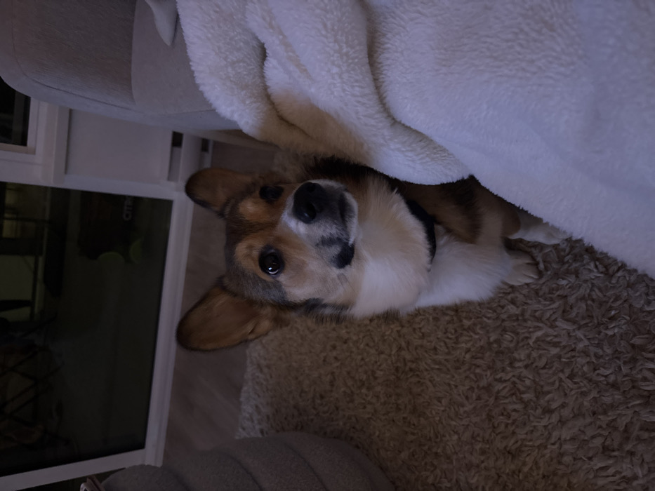 - "A tri-colored corgi lies on a brown rug, nestled partly under a white blanket" by FM-UQOWn2, licensed under CC BY 4.0