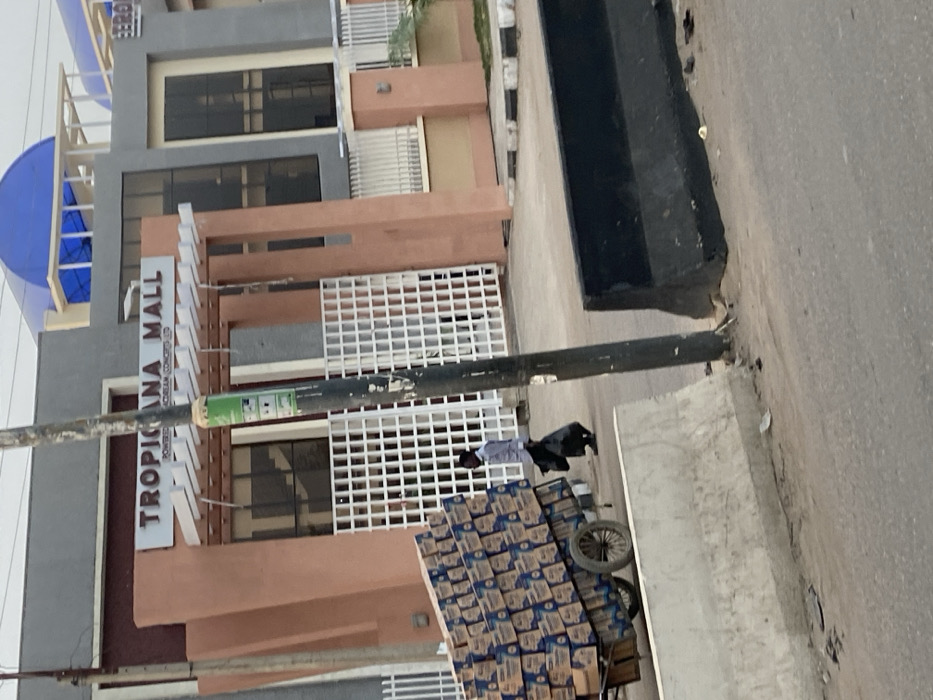 The image displays an urban scene in Fagge A, Nigeria, featuring the Tropicana Mall