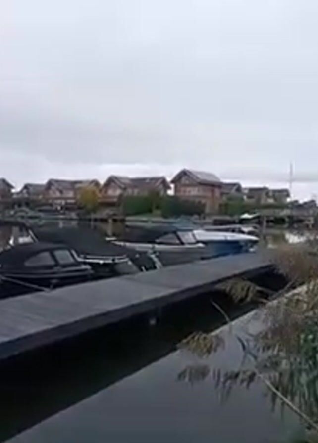 The camera pans across a calm body of water from a wooden dock. Several boats, mostly covered, are moored along the dock. In the background, houses with brown roofs and light-colored walls line the water's edge. The sky is overcast. The water is still, reflecting the sky and the houses. Tall reeds or grasses can be seen in the foreground along the water's edge. There is no visible activity. The scene appears serene and quiet.