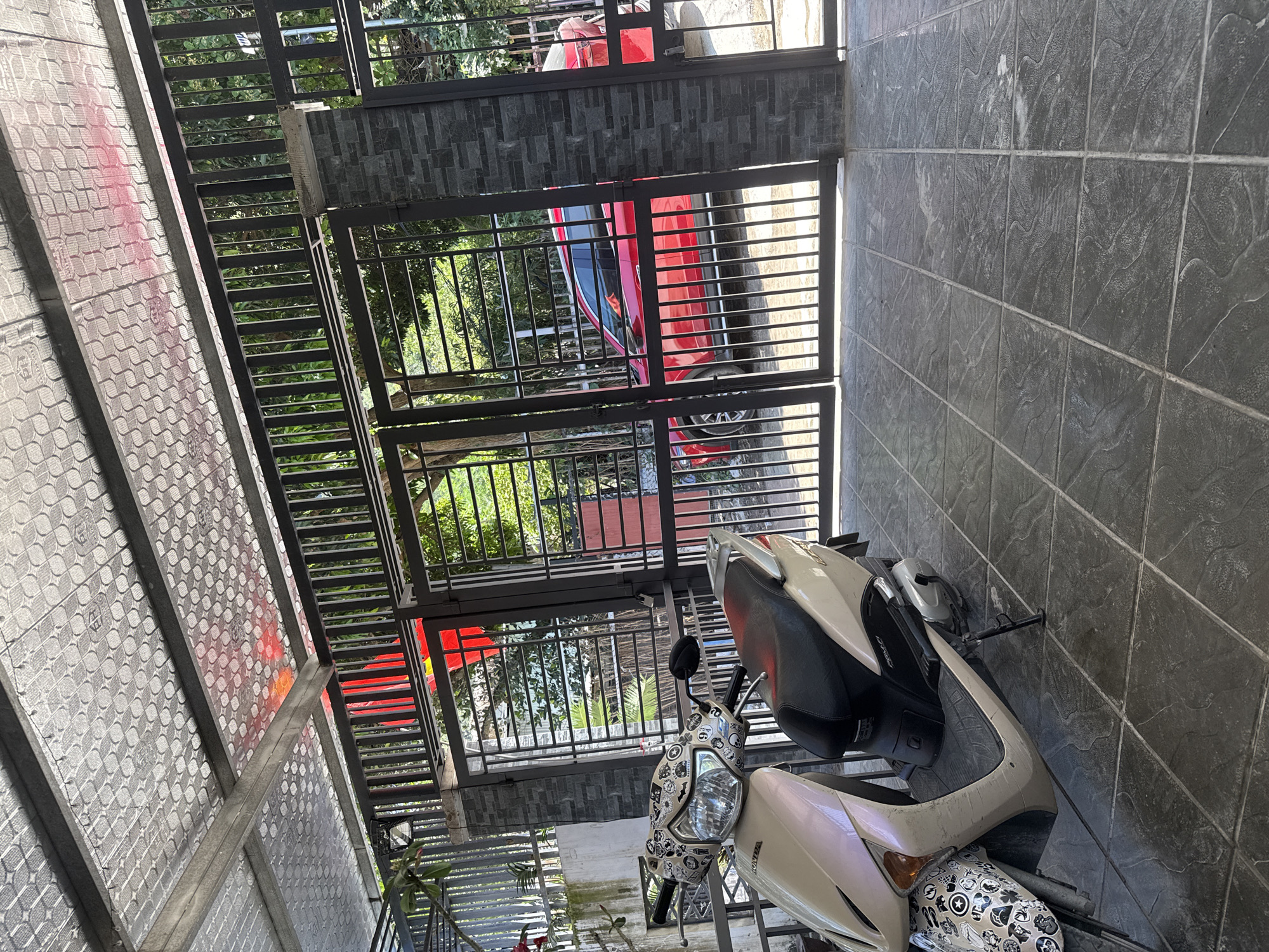 The image depicts a static scene within a residential property in Nha Trang, Vietnam, viewed from a covered outdoor area looking toward the exterior through a closed gate. In the foreground, a light beige Honda scooter, with extensive black and white graphic stickers adorning its front fender and upper fairing, is parked on a kickstand on dark grey, textured square tiles. Overhead, a corrugated metal roof structure, featuring a distinctive patterned reflective underside, is supported by metal beams. A reddish reflection is visible on the underside of the roof in the upper left. The midground is dominated by a dark metal gate composed of vertical bars, with its right pillar clad in dark, stacked rectangular stones. A padlock is visible securing the gate. Through the gate, a red SUV or crossover vehicle is partially visible, parked on a slight upward incline on an exterior paved surface. Beyond the vehicle and gate, lush green foliage and trees are present. In the upper left background, a red object, possibly a banner or the national flag of Vietnam, is visible. The scene is illuminated by bright daylight; no individuals, actions, or interactions are present.