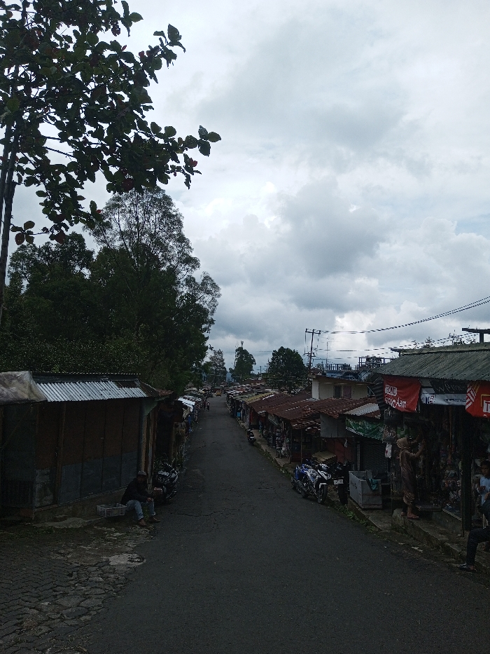 The image depicts a narrow asphalt road flanked by market stalls, situated in what is identified as the city of Satara, India. The sky is heavily overcast with dense gray cloud cover. On the left side of the foreground, a large tree with dark green foliage extends into the upper left quadrant. Below it, a row of small, semi-permanent market stalls with corrugated metal roofs and various paneling materials lines the street. One stall in the immediate foreground features a brown and gray facade. A single individual, dressed in dark clothing, is seated on a low, light-colored object in front of this stall. Two motorcycles are parked adjacent to this person and stall. The ground in the immediate left foreground consists of cobblestones transitioning to asphalt. The right side of the road is also lined with a continuous series of similar market stalls, each featuring corrugated metal roofs. Red banners with white text are visible on some stalls, with "BONDAN" and "TOKO AM" discernible on banners in the foreground. Several motorcycles are parked along this side of the road. Two individuals are present near the rightmost foreground stall: one standing, appearing to interact with merchandise, and a smaller figure partially visible nearby. The ground on this side is a raised concrete or paved walkway. The asphalt road, appearing dark and somewhat worn, extends into the distance, narrowing slightly as it recedes. Sparse pedestrian traffic is visible further down the street. In the midground and background, more market stalls, numerous green trees, utility poles, and an arrangement of overhead power lines are observed against the cloudy sky. Distant hills or structures are faintly visible on the horizon beneath the extensive cloud cover.
