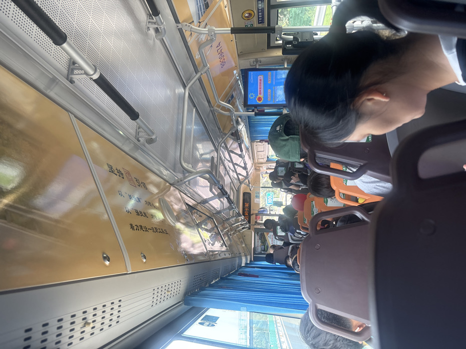 The image depicts the interior perspective of a public transit bus in motion. The bus, likely operating on the 889 route which services the Badaling Great Wall area, is positioned on an elevated roadway, consistent with travel within **Changping District, China**. Blue curtains are drawn over the left-side windows, partially revealing an exterior view of trees and a parallel elevated structure. The bus interior features multiple rows of brown and orange plastic passenger seats, largely occupied. In the immediate foreground, the back of a female's head with dark hair in a ponytail is visible on the right. Numerous other passengers are seated throughout the bus, with individuals observed holding personal devices. One passenger in the mid-section wears a backward-facing dark green baseball cap. Overhead, the ceiling comprises perforated metal panels and reflective gold-toned panels adorned with Chinese script, serving as advertisements or informational displays. Silver-colored handrails and overhead racks are present. Towards the front of the bus, a digital display screen shows a blue interface with Chinese characters, while a smaller adjacent display prominently indicates '100' and '达岭长城' (Badaling Great Wall). A sign near the exit instructs passengers to 'Please swipe card or scan code when getting off' (下车请刷卡或扫码). A partial bus route number, '889', is visible on an overhead panel.