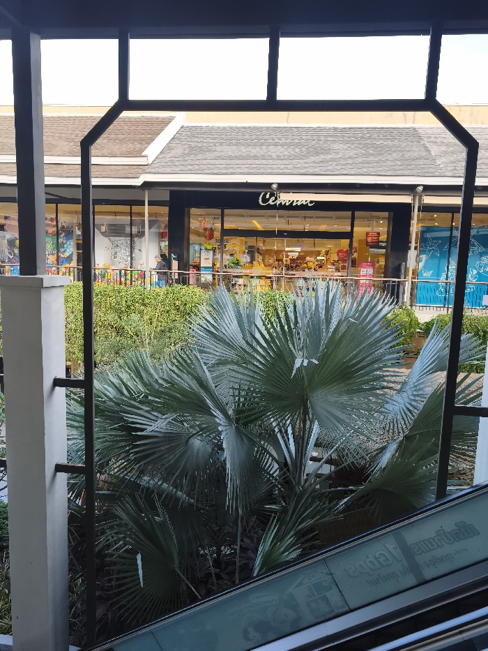 The image depicts a multi-level shopping mall environment in Baan Chaweng, Thailand, specifically facing a "Central" department store. The vantage point is from an elevated position, likely an upper floor or escalator landing, indicated by the partial view of an escalator's glass side panel and handrail in the lower right, reflecting foliage and Thai script. In the foreground and midground, a substantial silver-green fan palm plant dominates the center, obscuring portions of the background. To its left, a light-colored rectangular architectural pillar is visible. A dark metal railing structure frames the immediate foreground and top of the image. Beyond the palm and a horizontal hedge, the primary background consists of retail buildings with light-colored facades and dark, gabled roofs. The most prominent establishment is "Central," identified by its golden script logo above a wide, multi-pane glass entrance. The store's interior is brightly lit, displaying various merchandise. Multiple indistinct human figures are visible inside the "Central" store. On the pedestrian walkway directly in front of "Central," at least one individual wearing dark clothing is discernible, standing or walking. Adjacent storefronts feature colorful displays to the left and a blue-themed graphic to the right. The scene is illuminated by bright daylight.