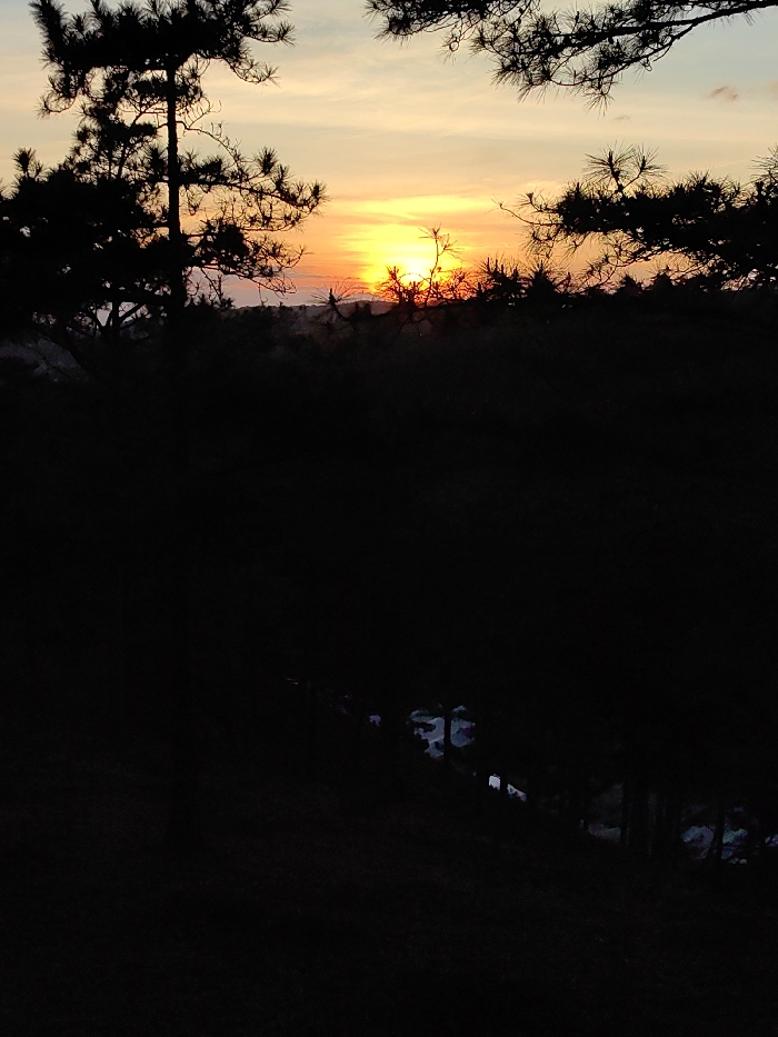 The image portrays a natural landscape within the city of Lạc Dương, Vietnam, at either sunrise or sunset. The sky, occupying the upper third of the frame, exhibits a gradient from light blue overhead to pale yellow and a dominant, intense orange-yellow glow at the horizon, where the sun's disk is visible, partially obscured. The foreground and midground are characterized by dense, heavily silhouetted pine trees, their branches and needle-like foliage appearing as opaque black forms against the brighter sky. The lower two-thirds of the image are profoundly underexposed, rendering the terrain almost entirely black. Faint, indistinct light-colored shapes are discernible in the deepest shadow, forming a linear pattern along what appears to be a downward slope or path in the lower midground. These shapes are not clearly identifiable but suggest the presence of multiple objects or figures, such as people or structures like tents, due to their arrangement and relative luminescence against the dark surroundings. No specific actions or interactions are discernible.