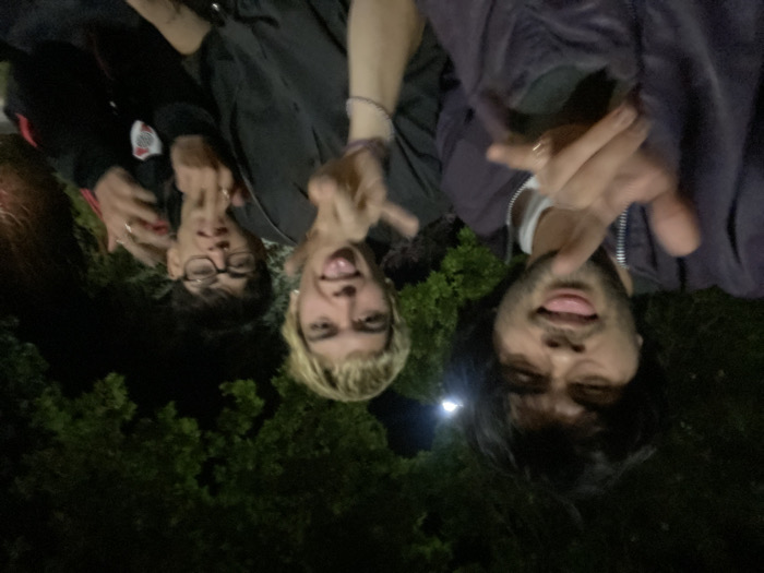 Three young men pose for an upside-down photo. The man on the left wears glasses and a black jacket with a white and red logo. The middle man has bleached blond hair and wears a dark-colored top. The man on the right wears a zip-up sweatshirt. All three stick their tongues out and make hand gestures towards the camera. They are outside in a dark area with trees in the background.