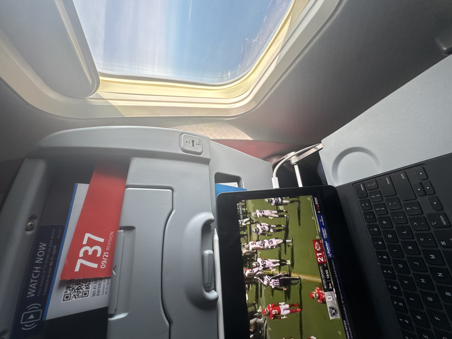 The image depicts the interior of a Boeing 737 aircraft *in flight*, as evidenced by a red "737 09/21 REVISION" card in the seat-back pocket and the aerial view from the window. The precise geographical city location cannot be determined, but the view from the window shows a clear blue sky, clouds, a large body of water, and a distant coastline or landmass. In the foreground, a black tablet with an attached keyboard case is positioned on a deployed light-grey tray table. The tablet's screen displays a live American football game, identified as "RAIDERS" versus "CHIEFS" by the scoreboard, which shows the score as Raiders 0, Chiefs 21 in the 3rd quarter with 13:50 remaining. Players in red uniforms (Chiefs) and white uniforms (Raiders), along with referees in black and white striped uniforms, are visible on the screen. A white charging cable is connected to the tablet from an unseen power source. The seat-back pocket above the tablet contains a white card with a QR code and text "WATCH NOW" and "WI-FI & ENTERTAINMENT", along with the aforementioned red "737" card. To the right of the seat-back pocket, a USB charging port is visible on the aircraft's internal paneling. Bright daylight illuminates the scene through the window, casting a warm glow.
