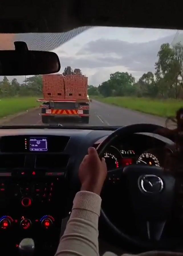 A person is driving a Mazda car on a wet road, following a truck loaded with bricks. The sky is overcast. Another car is approaching in the opposite lane. The interior of the Mazda is visible, including the dashboard and steering wheel. The driver's right hand is visible on the steering wheel.