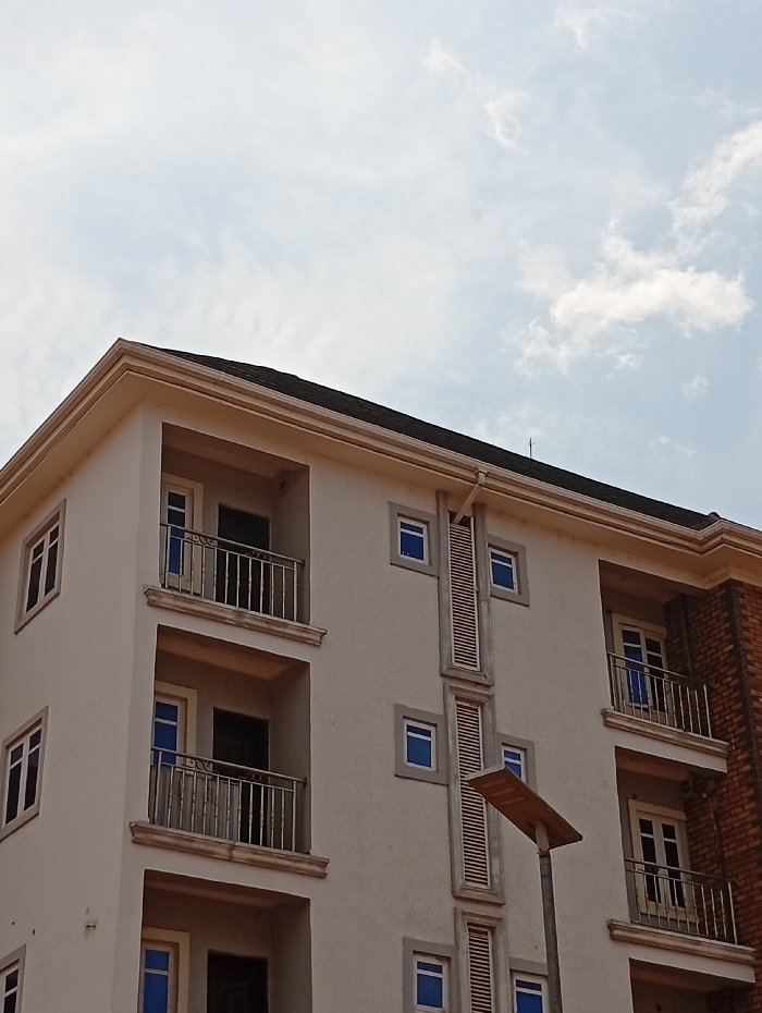 A multi-story building in Nsukka, Nigeria, is depicted under an overcast sky