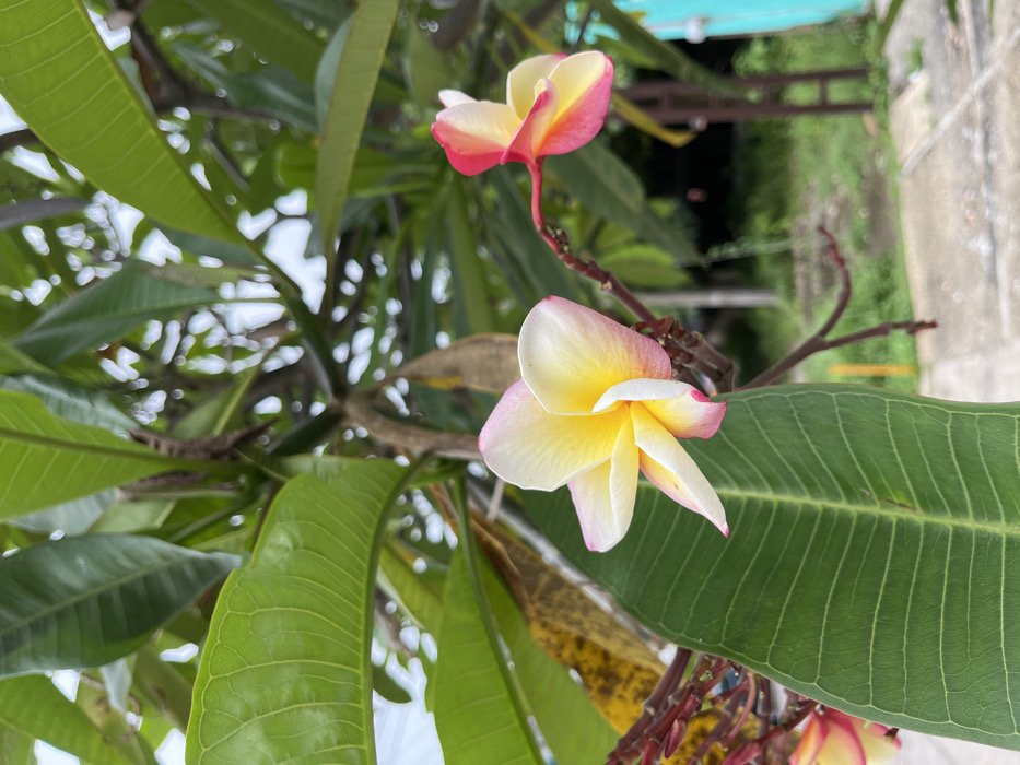 - "The image presents a close-up view of two Plumeria (Frangipani) flowers in Minatitlán, Mexico, set against a blurred natural and urban background" by FM-jnX3e2, licensed under CC BY 4.0