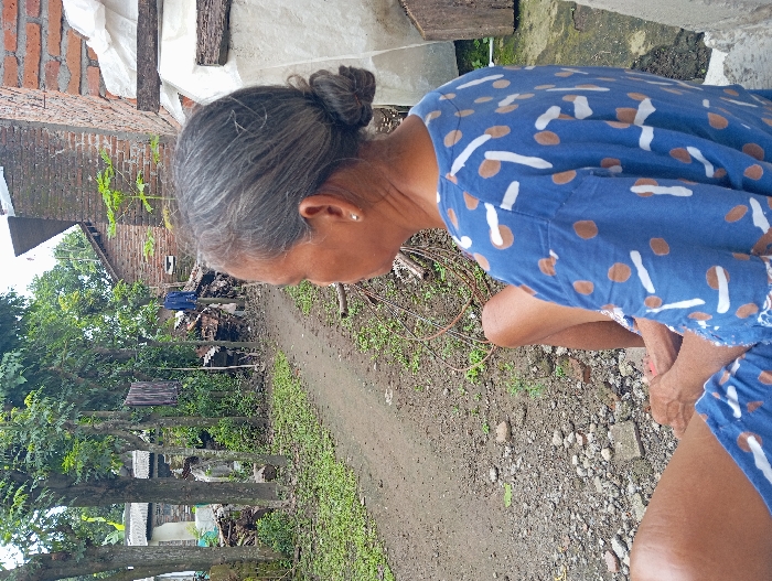 An individual, appearing to be an older female, is seated on a concrete surface, facing left and looking into the distance. She has gray hair styled in a bun and is wearing a blue short-sleeved top with white and brown abstract patterns, along with what appears to be matching shorts. A single, small, white stud earring is visible in her right ear. The scene depicts a rural or semi-rural setting in Waung, Indonesia. In front of the individual, a dirt path with scattered small stones and gravel extends into the background. To the immediate right, a brick wall and partially covered white objects are visible. The path is flanked by abundant green foliage and numerous trees. In the mid-ground, various structures are present, including a dilapidated building with a corrugated metal roof and exposed wooden supports. A blue shirt is seen hanging on a post, and other dark fabric hangs from a line or branch further down the path. Another rustic building with a visible brick wall is situated further back on the right side of the path. The sky appears overcast. No direct interactions between individuals are depicted.