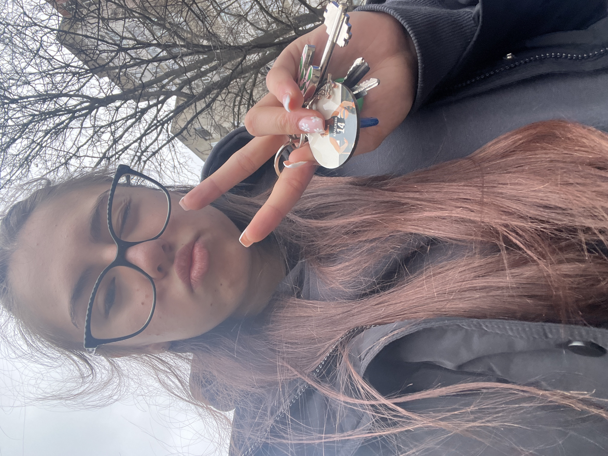 A young woman with glasses is holding a set of keys up to the camera while making a peace sign with her fingers. She has long, light brown hair. She is wearing a dark-colored jacket. In the background, the bare branches of a tree are visible. The image was taken outside in Sofia, Bulgaria.