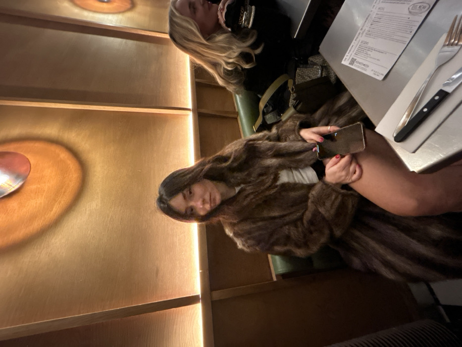 This image captures an interior scene, likely an upscale restaurant or brasserie, in Paris, France. Two females are seated on a dark green upholstered booth bench alongside a metallic-surfaced table under dim, warm lighting. The primary subject, a young adult female with long, dark, wavy hair, is positioned in the left foreground, looking directly at the camera with a neutral expression. She is wearing a long, brown fur coat over a white top, with her upper thighs exposed. Her fingernails are painted red, and she holds a dark-colored smartphone in both hands on her lap. To her right, a second female with long blonde hair is partially visible, facing right and looking away from the camera. She wears a dark top and multiple bracelets on her visible right wrist, with her hands clasped near her chin. A patterned handbag with a green strap rests on the booth seat between the two women. On the metallic table surface in the immediate foreground, a knife and fork are arranged on a small grey mat. A white piece of paper, possibly a menu or bill with text and a QR code, is also present on the table. The background features light brown wooden wall paneling with a horizontal strip of warm, ambient lighting. Above this lighting strip, abstract, organic-shaped metallic decorations, resembling eyes or large discs, are affixed to the wooden panels. A glimpse of a dark and light patterned floor is visible on the far left.