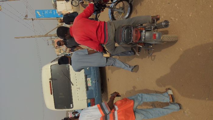 This image depicts a street scene in Ado, Nigeria, under a hazy sky