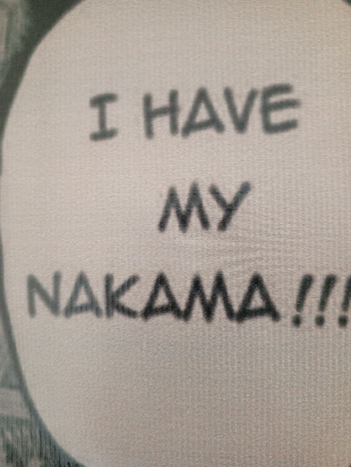 A white circular button displays the message "I HAVE MY NAKAMA!!!" in a bold, gray sans-serif font