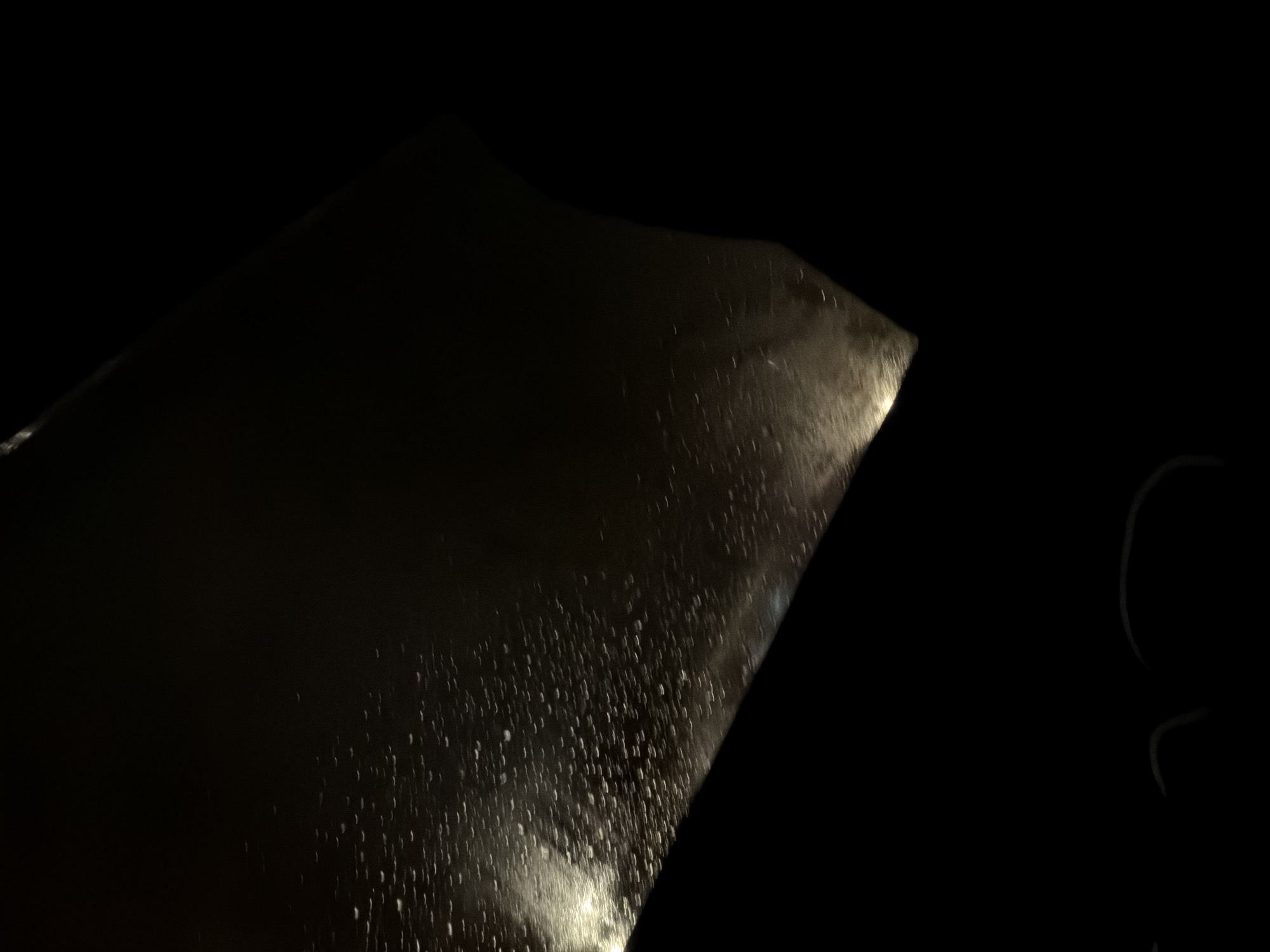 The scene depicts a nighttime view from inside a vehicle in Paris, France, during rainfall. The upper portion of the image is dominated by a transparent surface, consistent with a windshield, covered in numerous small, illuminated water droplets that appear as bright, curved streaks due to motion and light refraction. Two distinct, diffused sources of yellow-white light are visible through the rain-covered glass, positioned towards the lower-left and lower-right of the upper frame, likely originating from vehicle headlights or streetlights. The background beyond the glass is obscured by darkness and atmospheric conditions. The lower third of the image is occupied by dark, indistinct shapes, which represent elements of the vehicle's interior, possibly the dashboard or partial outlines of occupants, but no specific features or individuals are discernible. No explicit actions or interactions are depicted; the scene primarily conveys environmental conditions from a stationary or moving vehicle.