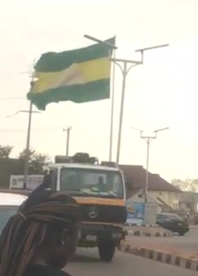 person with long, light brown braids wearing a black top, standing on a street in a city. In front of them, traffic is moving, including a white truck with a yellow stripe and a light brown truck bed. In the background, there is a green, yellow, and white flag hanging from a pole. The flag appears to be weathered and torn. A building with a sign for "CINEMAS" is also visible. The sky is overcast and the scene seems to be lit by diffuse daylight.