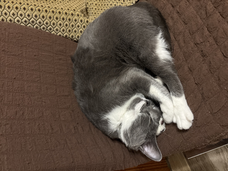 In the city of Slavyanovo, Bulgaria, a domestic cat is observed in a state of rest. The cat is bicolored, predominantly dark grey on its back and sides, with distinct white markings on its face, muzzle, chin, chest, belly, and all four paws. Its eyes are closed, indicating sleep. The animal is curled tightly, forming an oval shape, with its head tucked downwards towards its chest and its front paws crossed beneath its chin. The cat rests on a brown, coarsely textured fabric surface, which appears to be upholstery. In the upper right quadrant of the image, a section of a gold-colored fabric with a repeating dark geometric pattern is visible, positioned vertically behind the cat. No other subjects or objects are present within the immediate scene.