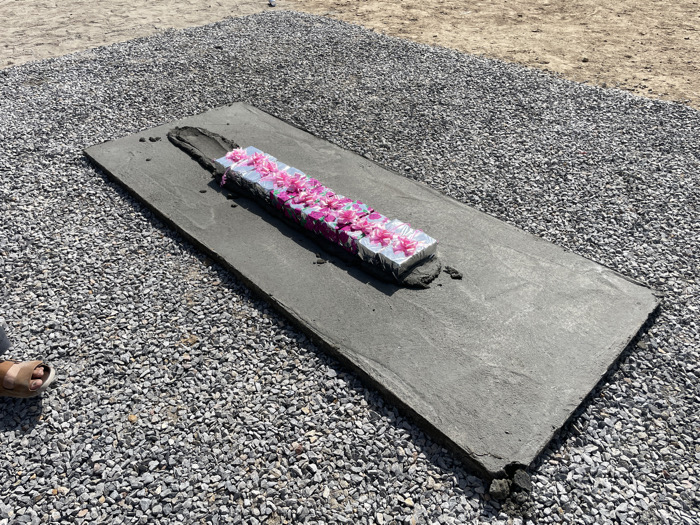 The image depicts an outdoor scene in Pir Dust, Afghanistan, under bright daylight. The ground is predominantly covered with small, light grey angular gravel, bordered by an area of light brown, dry earth in the upper background. A rectangular, flat concrete slab, exhibiting a fresh, uniform grey appearance and some surface variations, is positioned horizontally on the gravel. Resting centrally and longitudinally on this concrete slab is an elongated object, approximately 0.5 meters in length, wrapped in reflective silver foil or paper. A series of small, pink, artificial flowers are affixed in a linear arrangement along the top surface of the foil-wrapped object. Wet, dark grey mortar or cement secures the foil-wrapped object to the concrete slab, forming visible mounds at both ends. A partial view of a human left foot, clad in a light brown open-toed sandal, is visible in the bottom-left corner of the frame, positioned on the gravel adjacent to the concrete slab. No other individuals or direct interactions are visible. The scene suggests a recently installed commemorative or structural element.