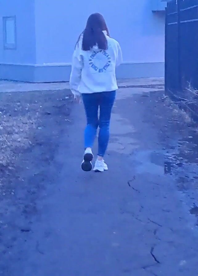 A woman walks away from the viewer on an uneven asphalt path. She wears a white sweatshirt, blue jeans, and white shoes. A light-colored building is on the left and a black fence on the right. The scene has a blue tint.