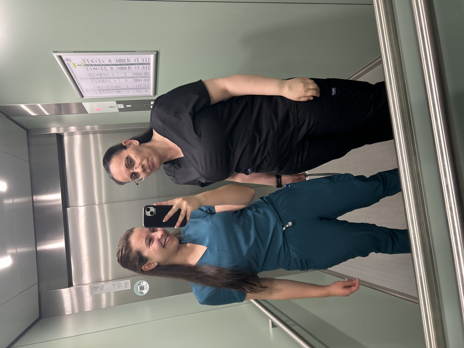 The image depicts two adult women inside an elevator in Blagoevgrad, Bulgaria, captured in a mirror selfie. The woman on the left, with long dark hair partially pulled back, smiles broadly while holding a dark-colored smartphone with a dual-camera setup in her right hand, using it to take the reflection photograph. She is wearing a teal blue medical scrub set, consisting of a V-neck top and drawstring pants with cargo pockets. Her fingernails exhibit a light-colored polish. The woman on the right, with dark hair pulled back, wears eyeglasses with clear frames and a dark smartwatch on her left wrist. She presents a neutral to slightly smirking expression and is dressed in a black medical scrub set, featuring a V-neck top with a wrap-style front and pants displaying a "Cherokee" brand logo on the left leg. The elevator interior features reflective lower walls with horizontal stainless steel handrails, light green upper walls displaying minor scuff marks, and stainless steel elevator doors in the background. Overhead lighting fixtures provide illumination. A framed document containing text is affixed to the right wall, while a smaller square sticker is visible on the left wall.