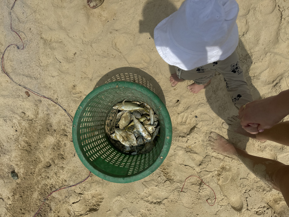 A green basket brimming with freshly caught fish sits on a sandy beach, casting a shadow in the sun. Beside the basket stands a toddler in a white hat and patterned pants, their tiny feet bare in the sand. Nearby, an adult's leg and foot are visible, suggesting they are holding the child's hand. Fishing lines are strewn on the sand around the basket.