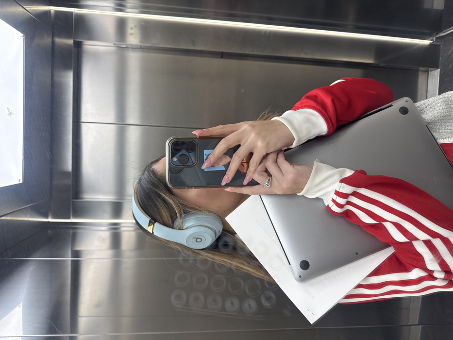 A person in a red and white striped sweater is taking a mirror selfie in an elevator. They're holding a laptop and a phone with a blue sticker on it. Light blue headphones are around their neck. The elevator interior is stainless steel with light fixtures at the top. The mirrored reflection shows the person and details of the elevator interior.