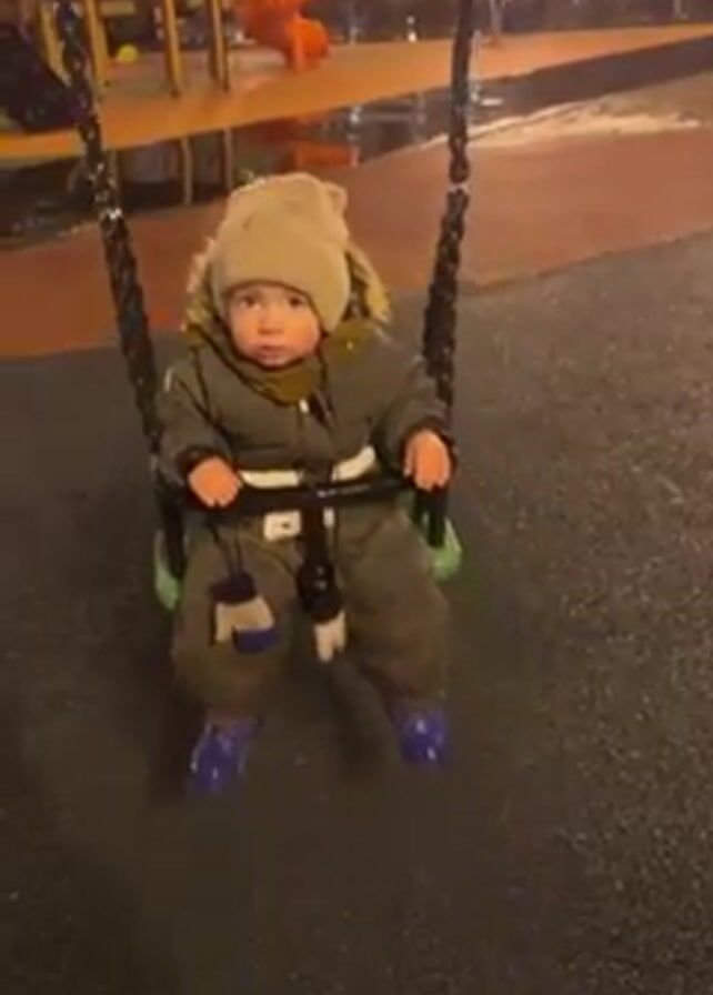 A young child, bundled in a khaki-colored snowsuit, a beige knit hat, and blue booties, sits in a baby swing at a playground. The swing hangs from black chains. The playground surface is a dark grey rubberized material. The playground appears to be wet, and there is a puddle reflecting light nearby. Other playground equipment, including a slide, is visible in the background, illuminated by artificial lights. The child looks at the camera. The swing moves gently.