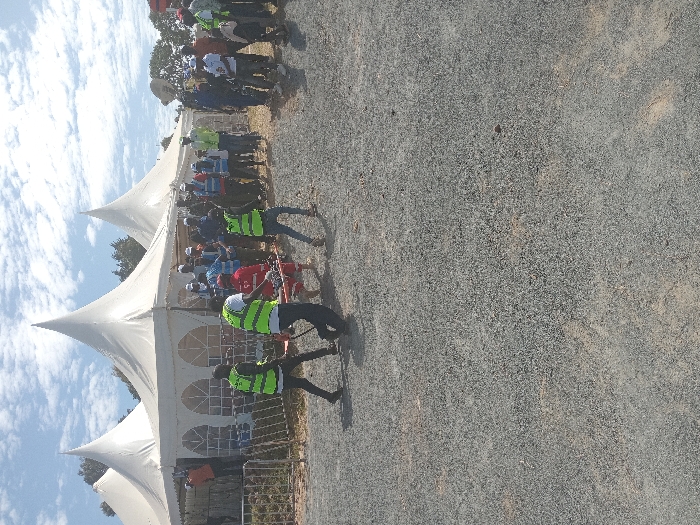 The image captures an outdoor scene in Ngenyilel ward, Kenya, under a partly cloudy sky. The ground is covered with light gray gravel. In the midground, four individuals are engaged in a simulated rescue operation. Two individuals, one in a white shirt and green reflective vest and another in an orange shirt and green reflective vest, are actively carrying a red stretcher. A person in a red uniform lies on the stretcher, serving as a casualty for the demonstration. A third individual, wearing a green reflective vest, and a fourth person in jeans and a blue top, walk alongside the stretcher. Behind this group, a crowd of approximately 25-30 people, many wearing reflective vests or caps, is gathered behind a low metal barrier. In the background, three large white tents with conical roofs are visible, suggesting an event or gathering. Trees and foliage line the horizon behind the tents.