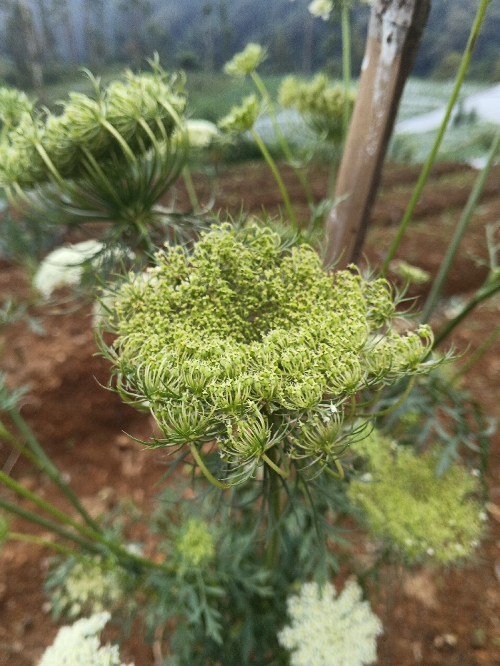 The image displays a close-up, high-angle view of a green plant, likely a carrot or wild carrot (Daucus carota), in an early flowering stage. The primary subject is a tightly clustered, dome-shaped green umbel of nascent florets, positioned centrally in the frame. Surrounding this main subject are other similar plants, some with more open, white flower clusters and others with green buds, extending into the blurred background. The ground beneath the plants is reddish-brown cultivated soil. A blurred, vertical wooden stake or support pole is visible on the right side of the frame. The distant background features indistinct green foliage of trees and a hazy, light-colored sky or terrain. No individuals are present. The scene is located in a cultivated field in Pinnwe, Myanmar (Burma).
