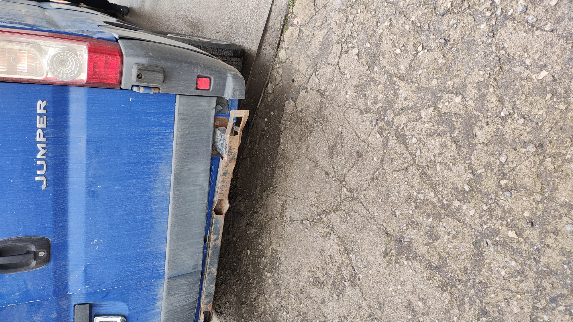 A close-up, angled shot depicts the damaged rear of a blue "JUMPER" van parked alongside a cracked concrete surface
