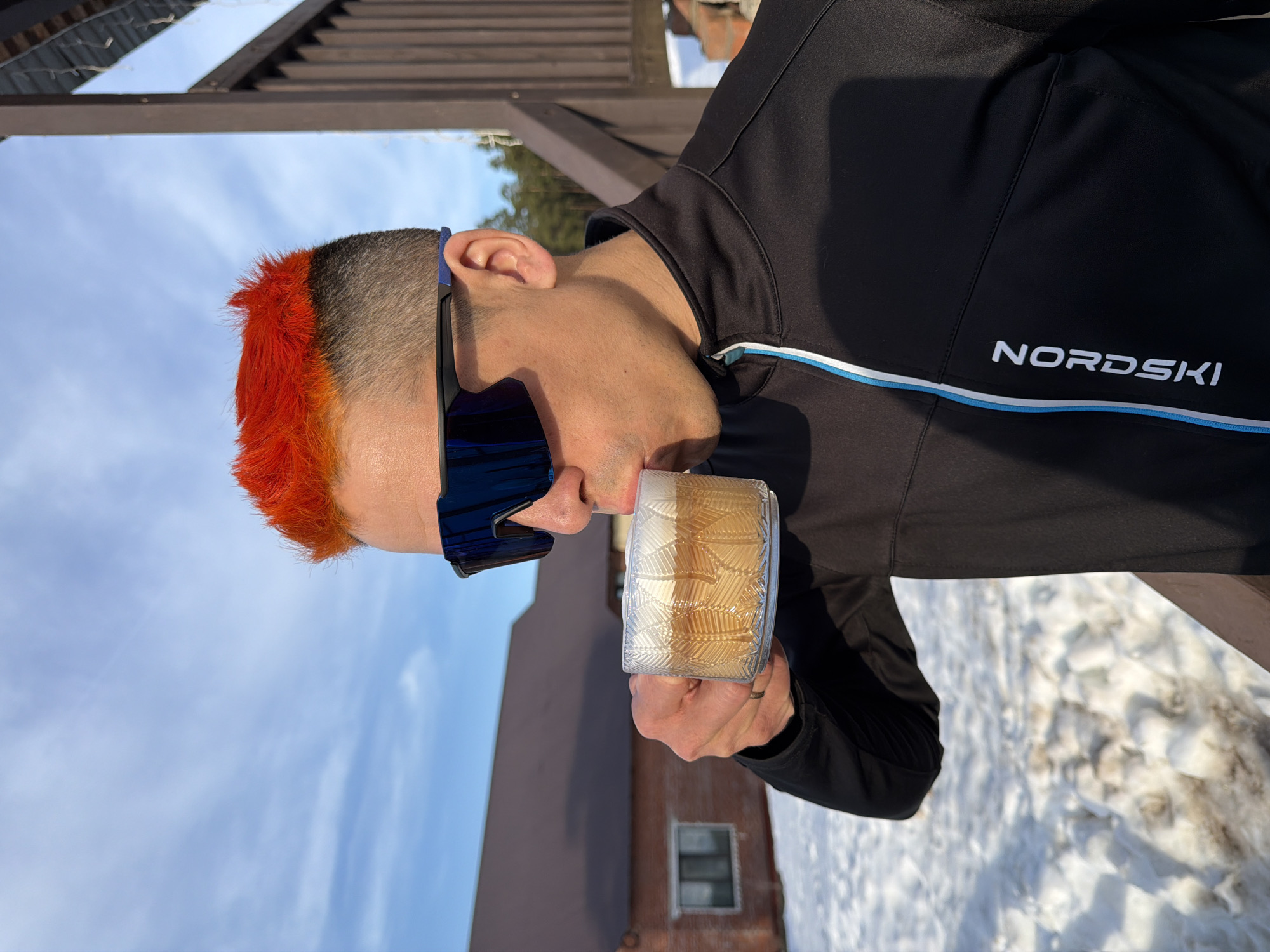 A person with orange and gray hair is drinking from a clear plastic cup. The cup appears to contain a beverage. The person is wearing dark sunglasses and a black jacket with white "NORDSKI" lettering on the right breast. The background includes a snow-covered ground, a building, trees, and a partly cloudy sky. There is also a wooden structure in the top portion of the frame. Based on similar images, this location is in Chaikovsky, Russia.