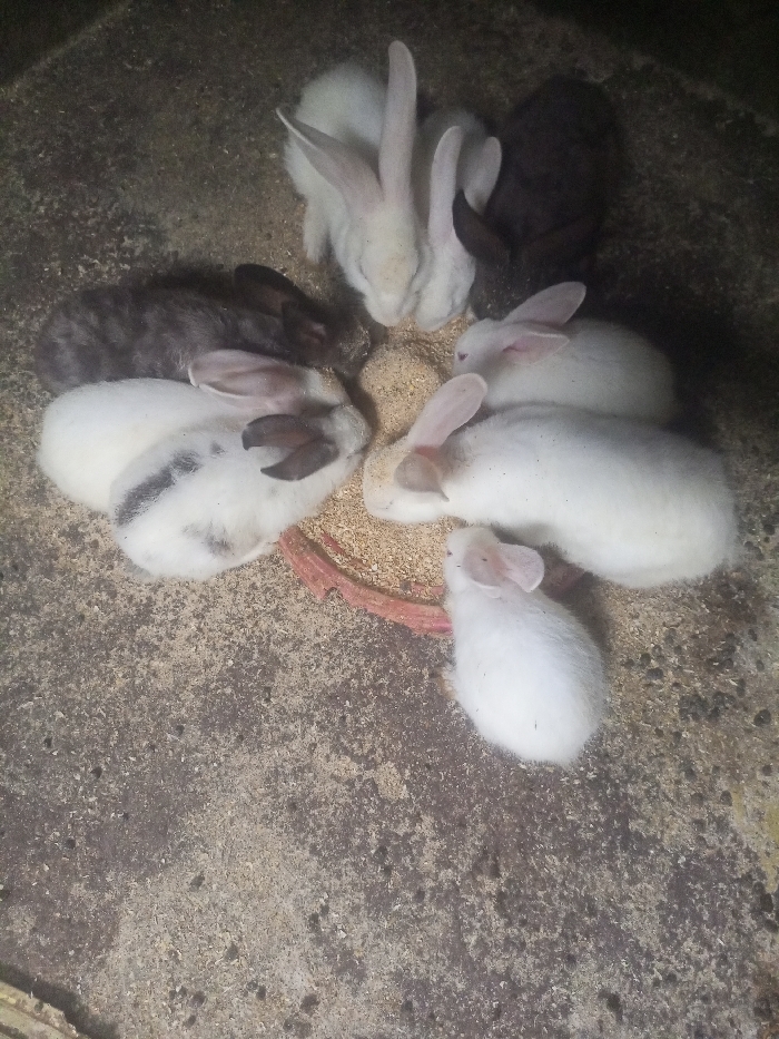 - "Seven rabbits huddle around a shallow dish of food on a concrete floor" by FM-4V0Yx1, licensed under CC BY 4.0