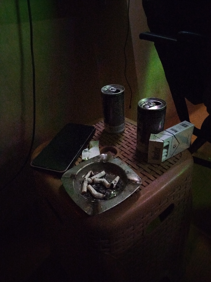 This dimly lit interior scene, located in Sarouja Municipality, Syria, displays several items arranged on a light brown, woven-pattern plastic stool. In the foreground, a square, metallic ashtray contains multiple discarded cigarette butts and ash. To the left of the ashtray, a black smartphone with its screen off lies diagonally. A small, crumpled white paper or wrapper is visible between the smartphone and the ashtray. Two open, dark-colored aluminum beverage cans stand upright on the stool; one is positioned behind the ashtray, and the other is to its right. Adjacent to the rightmost can, a white and silver "Rasler" brand cigarette pack lies on its side, open to reveal multiple white-tipped cigarettes. The background consists of a lightly colored wall illuminated with a distinct green hue, with dark cables running vertically along its left side. A dark, indistinct furniture item, possibly a chair, is partially visible in the upper right quadrant of the image. No individuals are present.