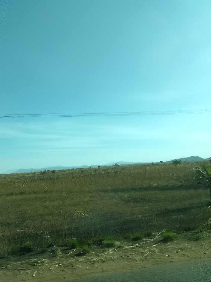 The image depicts an expansive rural landscape in the area of Kerang, Nigeria, under a clear, light blue sky. Three parallel utility lines traverse the upper mid-frame, appearing as thin horizontal lines. Along the distant horizon, a series of undulating hills or mountains are present. The midground consists of broad fields covered predominantly in dry, yellowish-brown vegetation, consistent with agricultural land, with darker earth patches visible. The immediate foreground features dark, dry soil interspersed with sparse green plant growth, suggesting a roadside or uncultivated strip. A dark, out-of-focus element is partially visible on the far right foreground. No identifiable human subjects, active interactions, or specific man-made structures are discernible within the frame.