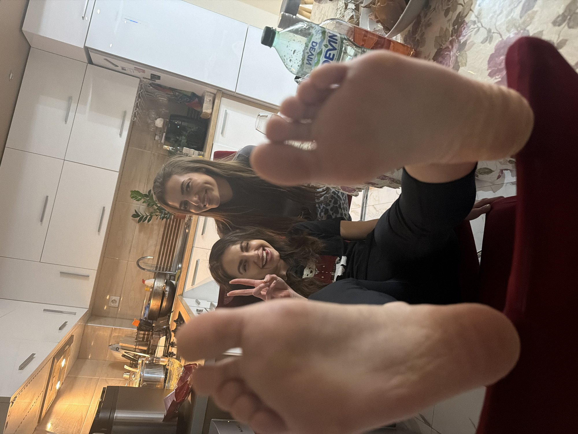 Two women are in a kitchen setting. One woman is lying on a red chair, making a peace sign with her right hand. The other woman is behind her, smiling. The foregorund is dominated by the soles of the lying woman's feet, which are pointed towards the camera. A water bottle with the label "DEVIN" is visible in the background. Kitchen cabinets are visible behind the women. There is no definitive evidence to specify that the location is Sandanski, Bulgaria.