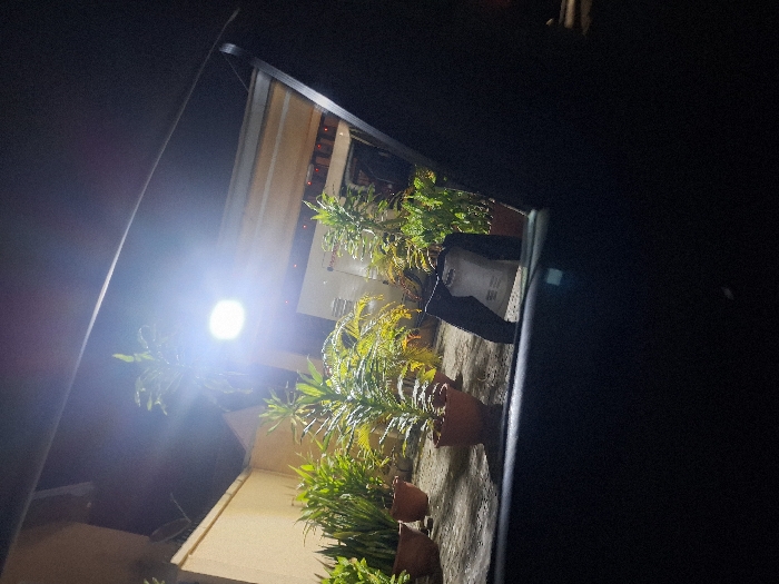 At night, a low-angle shot reveals an outdoor space illuminated by a bright light source. Potted plants of various sizes and green foliage are arranged along a ledge or wall. A dark garment hangs over the plants. The background suggests a building facade with some visible architectural details. The overall lighting creates strong contrasts between the illuminated plants and the surrounding darkness.