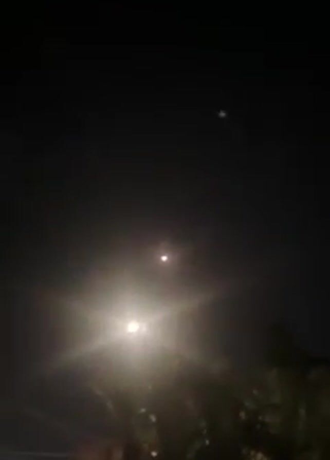 night scene with bright street lights illuminating a street and nearby buildings. The sky is dark, and a crescent moon is visible. A loud bang, possibly fireworks or an explosion, can be heard at the start of the video. The camera pans slightly, revealing power lines and the roofs of houses with red accents. The focus remains on the street lights and the moon in the dark sky.
