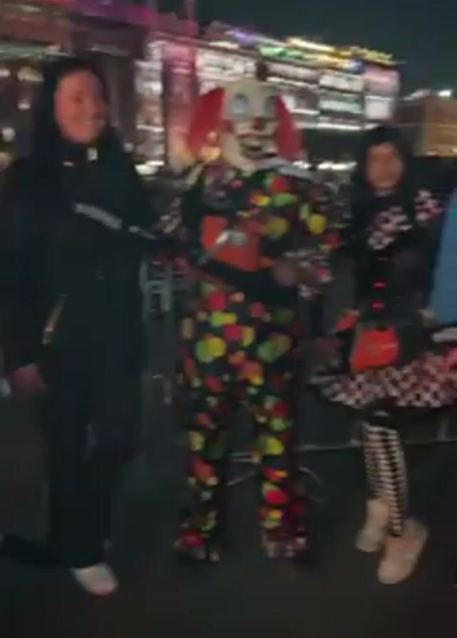 The video depicts a group of people, including at least four individuals dressed as clowns, standing in an outdoor setting at night