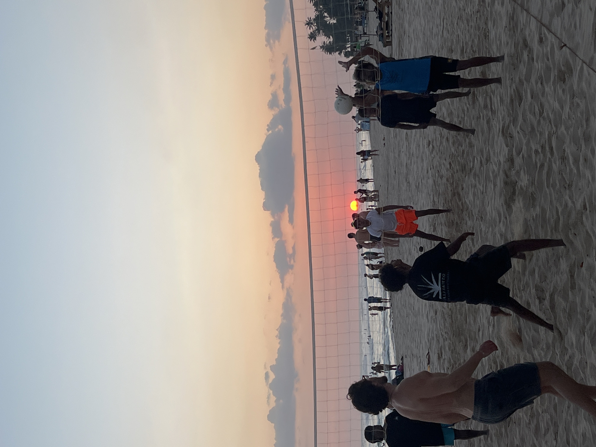 The image depicts a beach scene at sunset in Kathaluwa, Sri Lanka. A beach volleyball game is underway in the foreground and midground on sandy terrain. A white volleyball net stretches horizontally across the middle of the frame. On the left side of the net, a shirtless male with dark hair and a beard, wearing dark shorts, stands with his back partially to the camera, facing the net. To his right, another male in a black t-shirt with a white graphic and dark shorts is poised for play. On the opposite side of the net, a player in a blue sleeveless top and dark shorts is actively setting a white volleyball with both hands raised above his head. Another player in a black t-shirt and dark shorts stands near him, also engaged in the game. A player in a white t-shirt and orange shorts is partially visible to the far right of the net. The background features a wide sandy beach extending to the ocean. Numerous individuals are scattered along the shore, some standing and others wading or swimming in the water. Many figures are silhouetted. The sun, a prominent orange-red disc, is positioned low on the horizon, partially obscured by dark, elongated clouds. The sky displays a gradient from light blue at the top to a warm orange and pink near the horizon, indicative of sunset. Palm trees are visible on the far right background, along with indistinct beach structures.