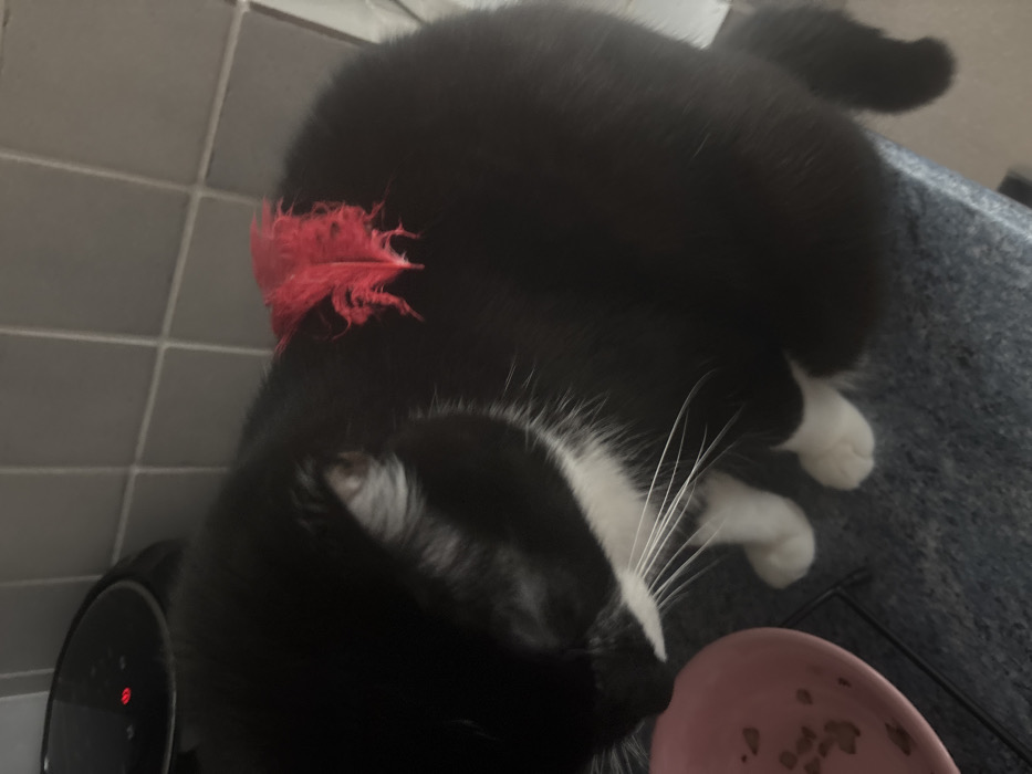 A black and white tuxedo cat is depicted on a dark grey countertop in what appears to be a kitchen located in Strasbourg, France. The cat is positioned on the left side of the frame, facing downwards towards a light pink bowl containing dry kibble, partially visible in the lower left corner. A distinctive, bright red feather is resting on the cat's upper back, near its shoulders. The cat's fur is predominantly black, with white markings on its muzzle, chest, and paws. Its whiskers are prominent. In the background, behind the cat, a black kitchen appliance with a red indicator light is visible, situated against a tiled wall with light grey square tiles and darker grey grout lines. The lighting suggests an indoor setting.