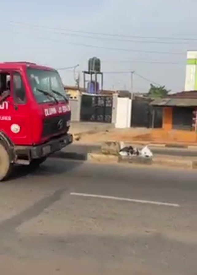 A woman in a yellow shirt and black leggings stands on a sidewalk near a road. She appears to be trying to flag down a vehicle. A red truck with a large, yellow cylindrical tank on the back passes by. The truck has the words "BOUJOT VENTURES" on the front. The truck drives down the road, followed by a yellow van. The setting appears to be a suburban or semi-urban area.