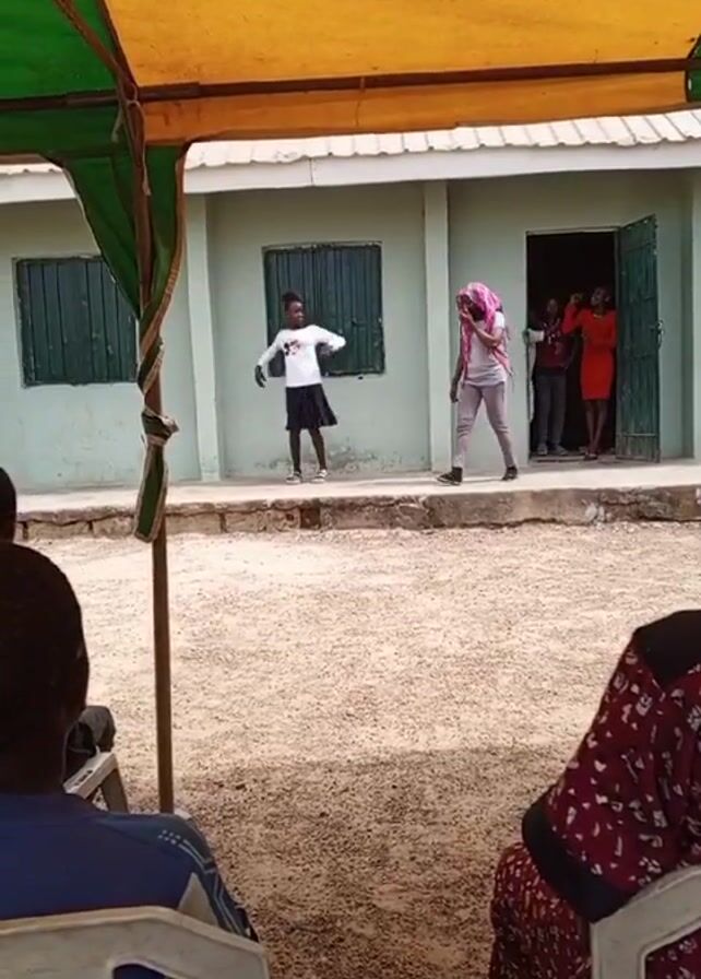 two young women walking away from each other on a concrete stage outside a building, while people sit under a tent watching them. The building is light green, with dark green window shutters. The young woman on the right wears a pink head covering, a gray top and black pants. The young woman on the left wears a white top and a black skirt. People stand in the doorway of the building, watching the two women on the stage. The tent has a green and yellow roof and a wooden pole.