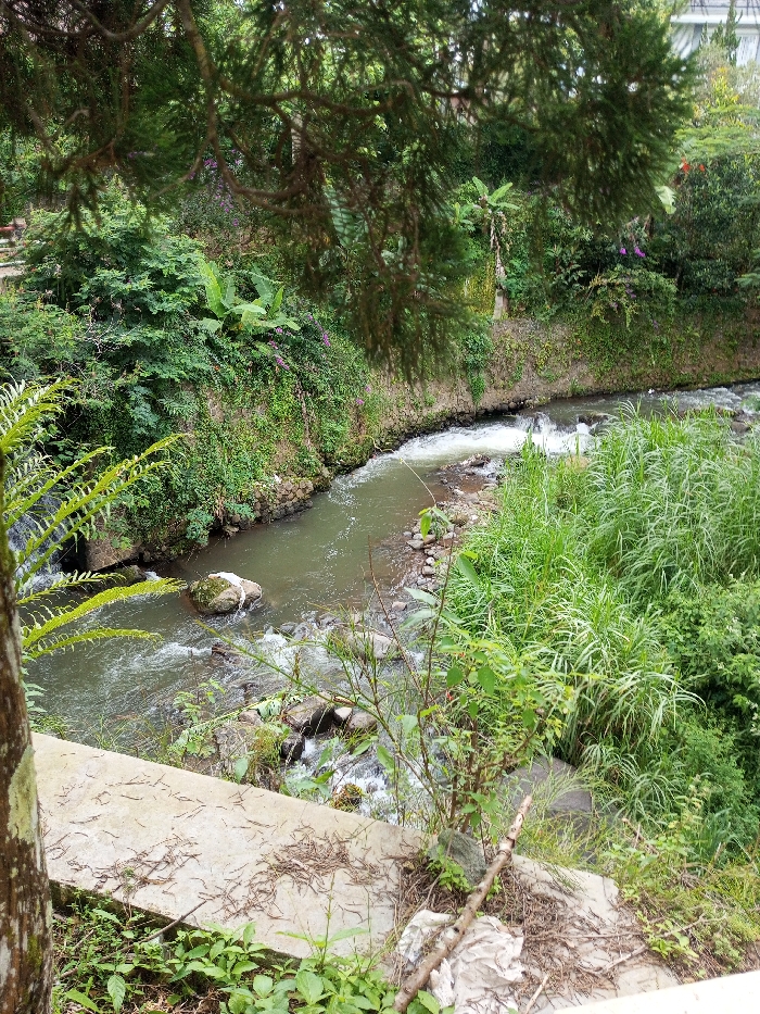 A flowing river dominates the frame, bordered by lush vegetation on either side. A variety of green plants and trees thrive along the riverbanks, creating a dense, natural setting. Part of the river's edge is lined with concrete or stone, and a tree branch with needles overhangs the scene, framing the landscape. The water is clear and reflects the greenery above, while some areas show gentle rapids as the river flows.