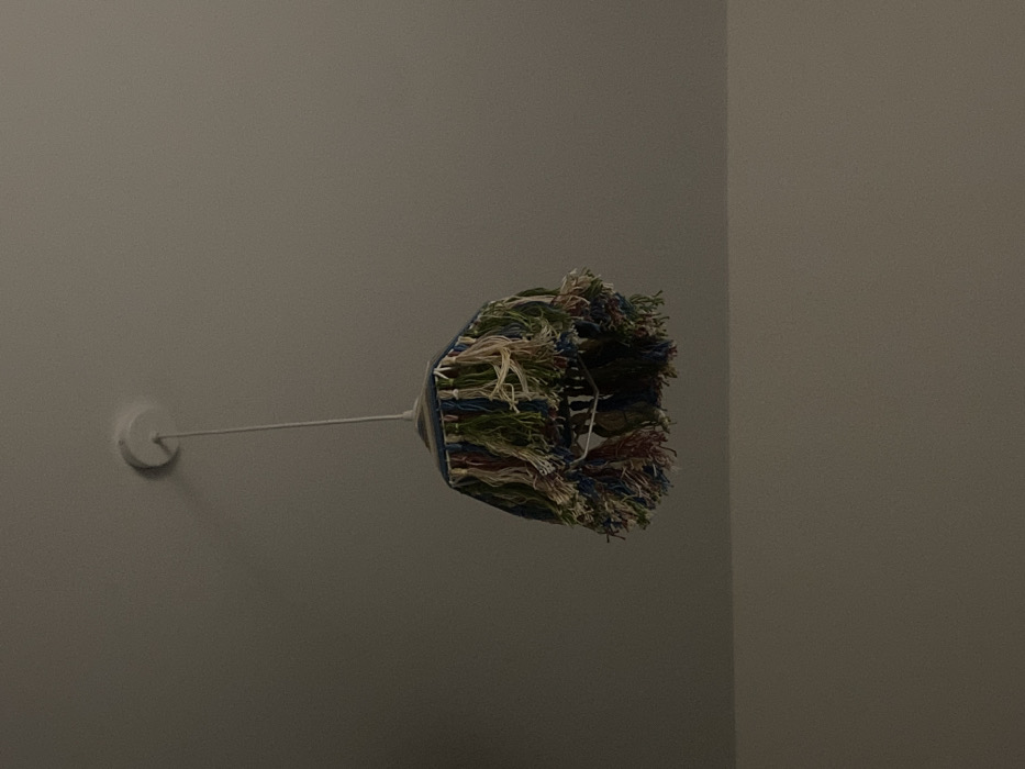 A fringed, multi-colored lampshade hangs from the ceiling. It's round but with a slight hexagonal shape. The fringes consist of blue, green, brown, and white threads. A thin white cord connects it to a circular mount on the gray ceiling. The surrounding walls are painted in a similar gray tone, with a corner visible in the upper right of the frame. The lighting is subdued, creating shadows and soft contrasts throughout the image.